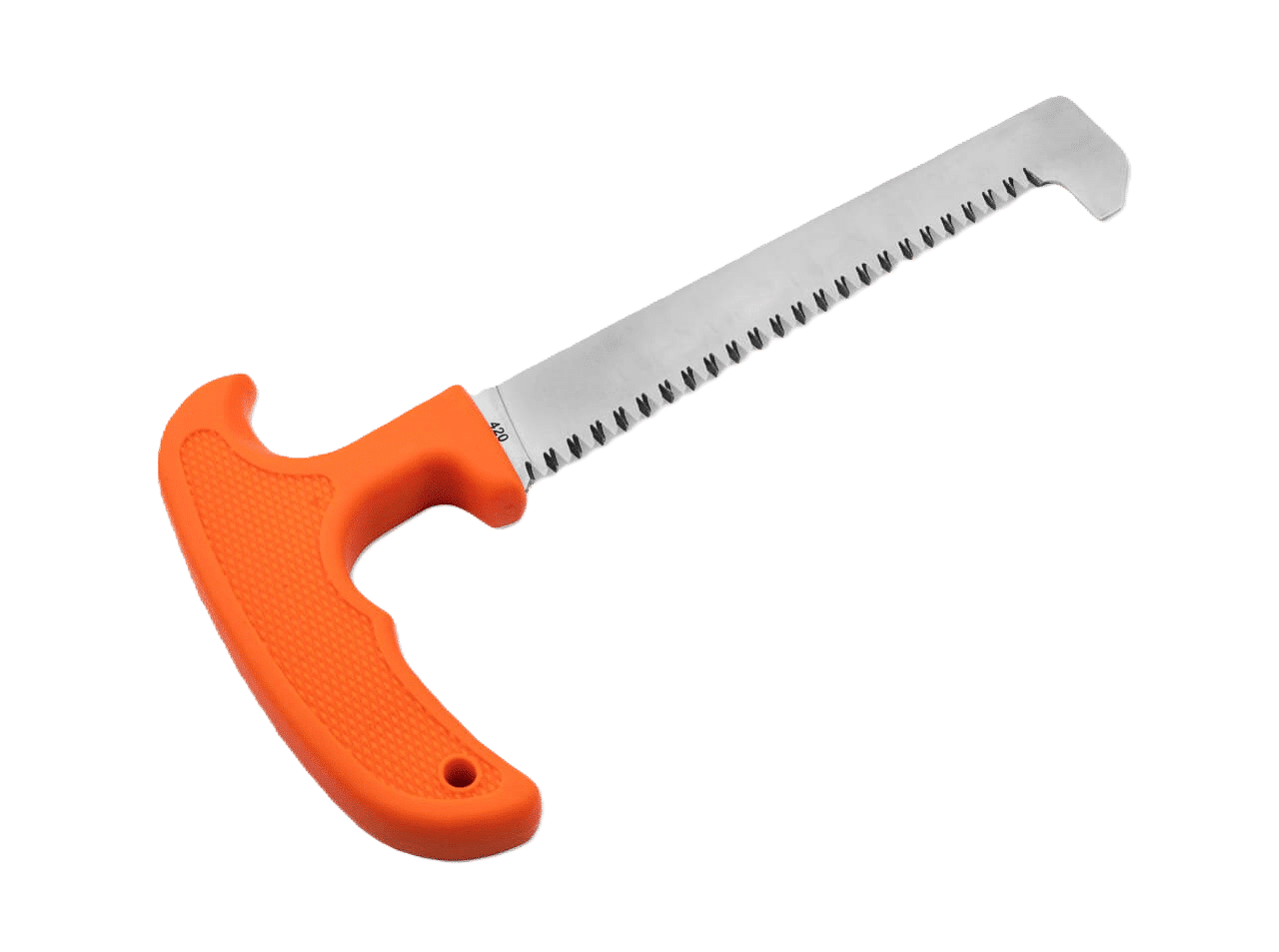 Kleur is fel oranje zodat de zaag makkelijk weer gevonden kan worden in het holst van de nacht, als er een varken ontweid moet worden