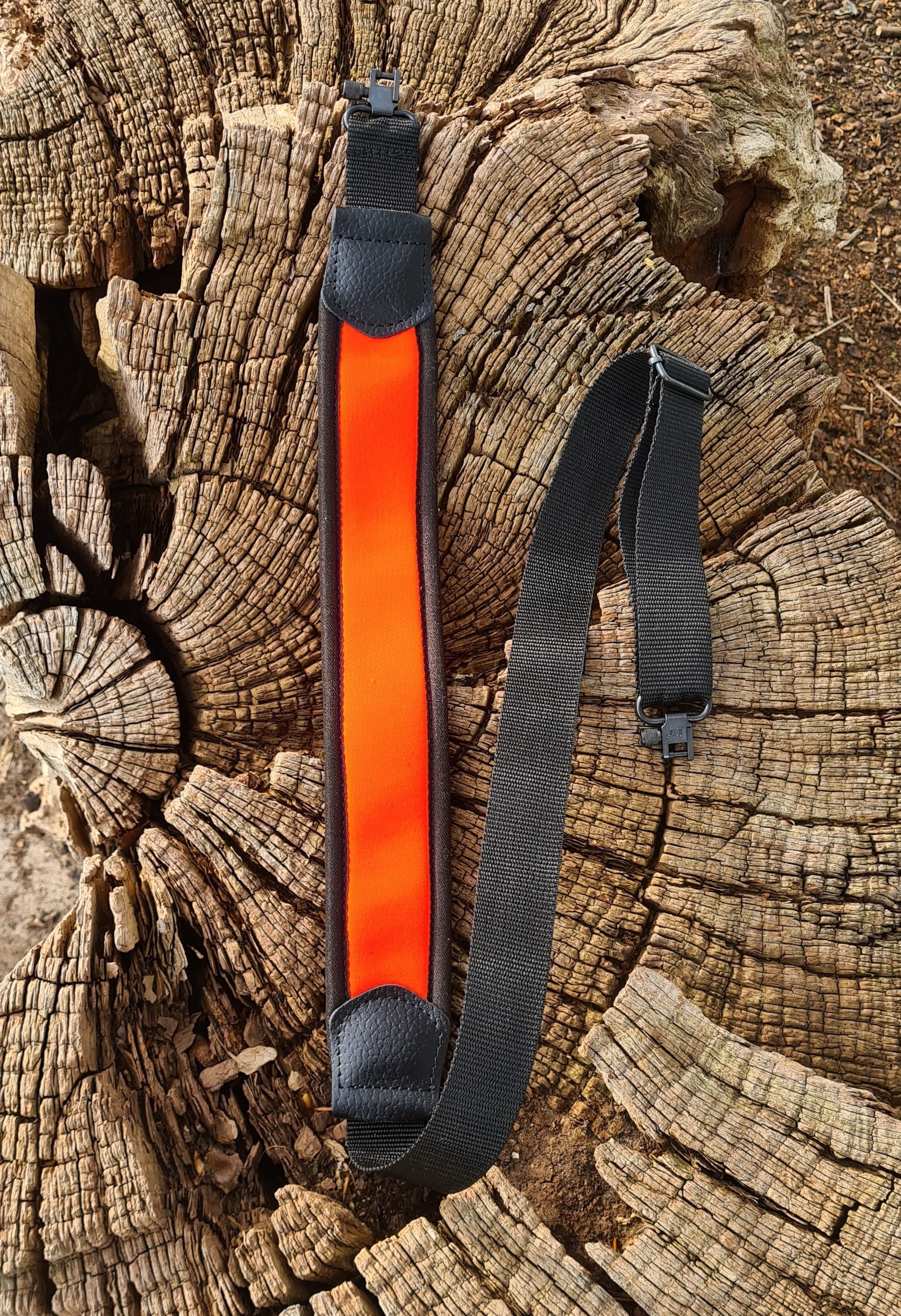 Neopreen geweerriem met oranje band afgewerkt met een zwarte bies.