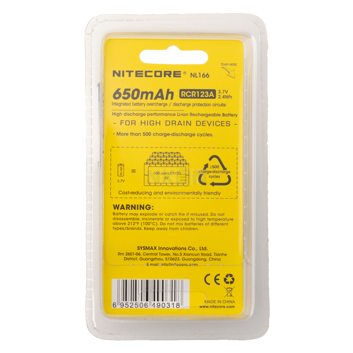 Kenmerken: Nitecore RCR123A 650mAh Batterij